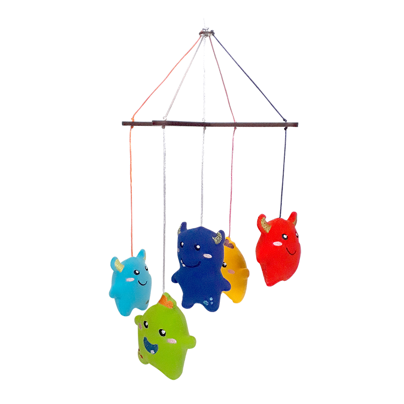 Nuestro móvil fabricado en tela antialérgica con un lindo diseño inspirado en unos amigables monstruos que llamarán fácilmente la atención del bebé este se puede colgar ya sea en su cuna o su coche para que pueda jugar entretenerse o conciliar el sueño Contamos con certificado de Conformidad de Producto (SGS) el cual asegura que nuestros productos y su material de fabricación son 100% seguros para los niños